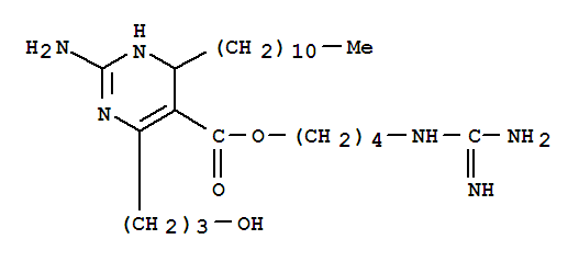 - Name: 5-Pyrimidinecarboxylicacid, 2-amino-1,4-dihydro-6-(3-hydroxypropyl)-4-undecyl-,4-[(aminoiminomethyl)amino]butyl ester (9CI)