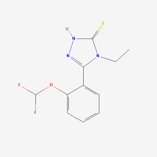- Synonyms:832127-32-9;5-(2-(Difluoromethoxy)phenyl)-4-ethyl-4H-1,2,4-triazole-3-thiol;5-[2-(difluoromethoxy)phenyl]-4-ethyl-4H-1,2,4-triazole-3-thiol;3-[2-(difluoromethoxy)phenyl]-4-ethyl-1H-1,2,4-triazole-5-thione;5-(2-Difluoromethoxy-phenyl)-4-ethyl-4H-[1,2,4]-triazole-3-thiol;AKOS000305547;CS-0298287;EN300-228890;5-(2-difluoromethoxy-phenyl)-4-ethyl-4h-[1,2,4]triazole-3-thiol;5-[2-(DIFLUOROMETHOXY)PHENYL]-4-ETHYL-4H-1,2,4-TRIAZOL-3-YLHYDROSULFIDE