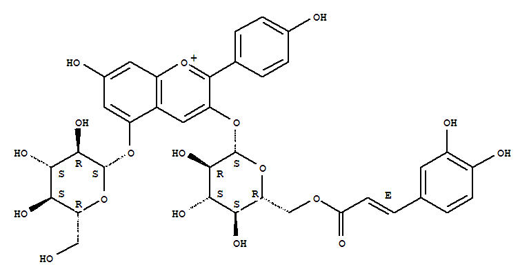 - Synonyms:1-Benzopyrylium,3-[[6-O-[3-(3,4-dihydroxyphenyl)-1-oxo-2-propenyl]-b-D-glucopyranosyl]oxy]-5-(b-D-glucopyranosyloxy)-7-hydroxy-2-(4-hydroxyphenyl)-,(E)-