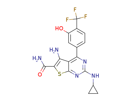 - Synonyms:5-amino-2-(cyclopropylamino)-4-(3-hydroxy-4-(trifluoromethyl)phenyl)thieno[2,3-d]pyrimidine-6-carboxamide