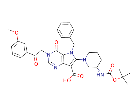- Synonyms:5-benzyl-6-((S)-3-tert-butoxycarbonylamino-piperidin-1-yl)-3-[2-(3-methoxy-phenyl)-2-oxo-ethyl]-4-oxo-4,5-dihydro-3H-pyrrolo[3,2-d]pyrimidine-7-carboxylic acid