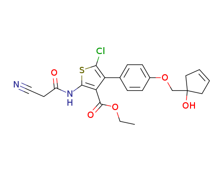 - Synonyms:5-chloro-2-(2-cyano-acetylamino)-4-[4-(1-hydroxy-cyclopent-3-enylmethoxy)-phenyl)-thiophene-3-carboxylic acid ethyl ester