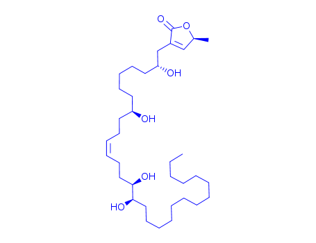 - Synonyms:2(5H)-Furanone,5-methyl-3-(2,8,15,16-tetrahydroxy-11-triacontenyl)-,[5S-[3(2S*,8S*,11Z,15S*,16S*),5R*]]-; 2(5H)-Furanone,5-methyl-3-[(2R,8R,11Z,15R,16R)-2,8,15,16-tetrahydroxy-11-triacontenyl]-, (5S)-(9CI); Giganin
