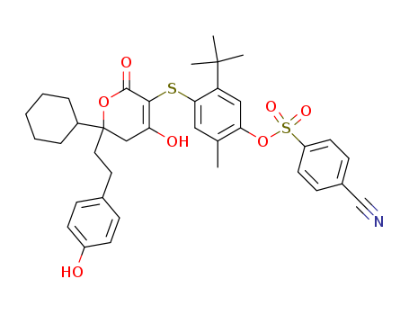 - Synonyms:4-Cyanobenzenesulfonicacid5-tert-butyl-4-[[6-cyclohexyl-4-hydroxy-6-[2-(4-hydroxyphenyl)ethyl]-2-oxo-5,6-dihydro-2H-pyran-3-yl]sulfanyl]-2-methylphenylester