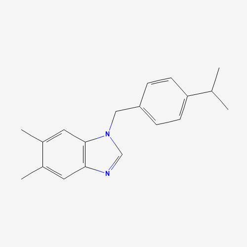 - Synonyms:5,6-dimethyl-1-{[4-(propan-2-yl)phenyl]methyl}-1H-1,3-benzodiazole;637325-09-8;1-(4-isopropylbenzyl)-5,6-dimethyl-1H-benzimidazole;5,6-dimethyl-1-[(4-propan-2-ylphenyl)methyl]benzimidazole;5,6-dimethyl-1-[4-(propan-2-yl)benzyl]-1H-benzimidazole;DTXSID001168106;STK189781;AKOS001146983;CS-0248295;EN300-39581;Z57300137;5,6-Dimethyl-1-[[4-(1-methylethyl)phenyl]methyl]-1H-benzimidazole