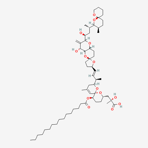 - Synonyms:7-O-PALMITOYLOKADAIC ACID;Acanthifolicin, 9,10-deepithio-9,10-didehydro-, 7-hexadecanoate;118745-19-0;C60-H98-O14;1,7-Dioxaspiro(5.5)undec-10-ene-2-propanoic acid, alpha-hydroxy-alpha,10-dimethyl-8-((1R,2E)-1-methyl-3-((2R,4'aR,5R,6'S,8'R,8'aS)-octahydro-8'-hydroxy-6'-((1S,3S)-1-hydroxy-3-((2S,3R,6S)-3-methyl-1,7-dioxaspiro(5.5)undec-2-yl)butyl)-7'-methylenespiro(furan-2(3H),2'(3'H)-pyrano(3,2-b)pyran)-5-yl)-2-propenyl)-5-((1-oxohexadecyl)oxy)-