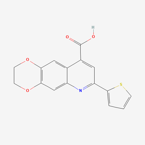 - Synonyms:7-(thiophen-2-yl)-2H,3H-[1,4]dioxino[2,3-g]quinoline-9-carboxylic acid;847508-31-0;7-Thiophen-2-yl-2,3-dihydro-[1,4]dioxino[2,3-g]quinoline-9-carboxylic acid;MLS000120677;CHEMBL1341531;REGID_for_CID_3162461;HMS1623I18;HMS2265A12;STK406287;AKOS000664477;CCG-128440;SMR000097521;CS-0263423;EN300-86800;SR-01000123868;SR-01000123868-1;Z228588824;7-(thiophen-2-yl)-2H,3H-[1,4]dioxino[2,3-g]quinoline-9-carboxylicacid;7-(thiophen-2-yl)-2,3-dihydro[1,4]dioxino[2,3-g]quinoline-9-carboxylic acid