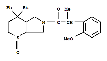 - Synonyms:Thiopyrano[2,3-c]pyrrole,octahydro-6-[2-(2-methoxyphenyl)-1-oxopropyl]-4,4-diphenyl-, 1-oxide, [1R-[1a,4ab,6(R*),7ab]]-; RP 73467