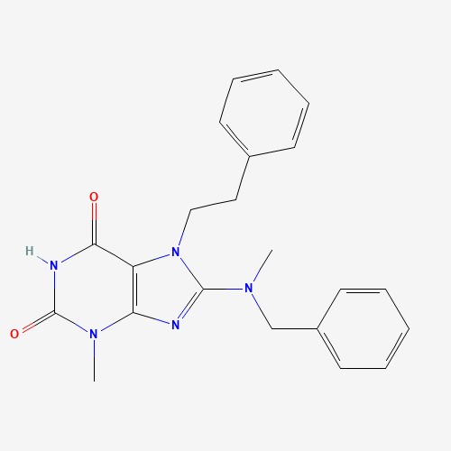 - Synonyms:Oprea1_102914;AKOS024408695;8-(Benzyl(methyl)amino)-3-methyl-7-phenethyl-1H-purine-2,6(3H,7H)-dione;8-[benzyl(methyl)amino]-3-methyl-7-(2-phenylethyl)-3,7-dihydro-1H-purine-2,6-dione;332905-04-1;8-[benzyl(methyl)amino]-3-methyl-7-(2-phenylethyl)-2,3,6,7-tetrahydro-1H-purine-2,6-dione
