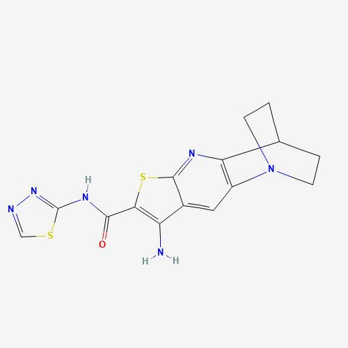 - Synonyms:889949-64-8;5-amino-N-(1,3,4-thiadiazol-2-yl)-7-thia-1,9-diazatetracyclo[9.2.2.0^{2,10}.0^{4,8}]pentadeca-2(10),3,5,8-tetraene-6-carboxamide;5-Amino-N-(1,3,4-thiadiazol-2-yl)-7-thia-1,9-diazatetracyclo[9.2.2.02,10.04,8]pentadeca-2(10),3,5,8-tetraene-6-carboxamide;8-amino-N-(1,3,4-thiadiazol-2-yl)-3,4-dihydro-2H-1,4-ethanothieno[2,3-b][1,5]naphthyridine-7-carboxamide;DTXSID901112493;STK687081;AKOS001727707;SS-0079;CS-0330536;8-Amino-3,4-dihydro-N-1,3,4-thiadiazol-2-yl-2H-1,4-ethanothieno[2,3-b]-1,5-naphthyridine-7-carboxamide