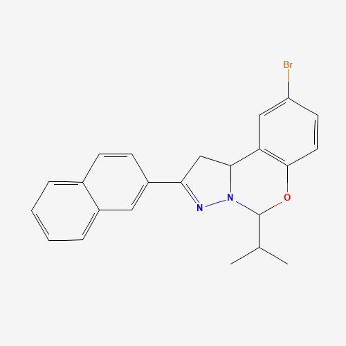 - Synonyms:303059-86-1;9-Bromo-5-isopropyl-2-(naphthalen-2-yl)-5,10b-dihydro-1H-benzo[e]pyrazolo[1,5-c][1,3]oxazine;AKOS024423960;9-BROMO-5-ISOPROPYL-2-(2-NAPHTHYL)-1,10B-DIHYDROPYRAZOLO(1,5-C)(1,3)BENZOXAZINE;12-bromo-4-(naphthalen-2-yl)-7-(propan-2-yl)-8-oxa-5,6-diazatricyclo[7.4.0.0,trideca-1(13),4,9,11-tetraene