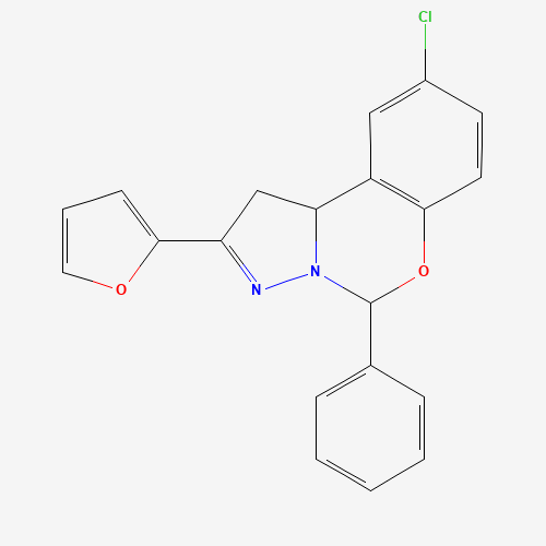 - Synonyms:303104-37-2;9-Chloro-2-(furan-2-yl)-5-phenyl-5,10b-dihydro-1H-benzo[e]pyrazolo[1,5-c][1,3]oxazine;STK555524;AKOS005483296;9-CHLORO-2-(2-FURYL)-5-PHENYL-1,10B-DIHYDROPYRAZOLO(1,5-C)(1,3)BENZOXAZINE;9-chloro-2-(furan-2-yl)-5-phenyl-1,10b-dihydropyrazolo[1,5-c][1,3]benzoxazine