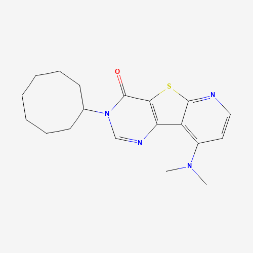 - Synonyms:CHEMBL223399;SCHEMBL8238350;DTXSID201136565;9-dimethylamino-3-cyclooctyl-3H-5-thia-1,3,6-triazafluoren-4-one;BDBM50177059;869802-59-5;3-Cyclooctyl-9-(dimethylamino)pyrido[3',2':4,5]thieno[3,2-d]pyrimidin-4(3H)-one;3-Cyclooctyl-9-dimethylamino-3H-pyrido[3'',2'':4,5]thieno[3,2-d]pyrimidin-4-one