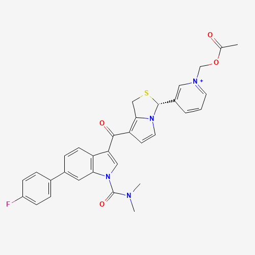 - Synonyms:ABT-299 cation;NL100VQR8T;UNII-NL100VQR8T;172174-30-0;Pyridinium, 1-((acetyloxy)methyl)-3-(7-((1-((dimethylamino)carbonyl)-6-(4-fluorophenyl)-1H-indol-3-yl)carbonyl)-1H,3H-pyrrolo(1,2-C)thiazol-3-yl)-, (R)-;CHEMBL317090;CHEMBL1183764;BDBM50062086;1-Acetoxymethyl-3-{(R)-7-[1-dimethylcarbamoyl-6-(4-fluoro-phenyl)-1H-indole-3-carbonyl]-1H-pyrrolo[1,2-c]thiazol-3-yl}-pyridinium;chloride