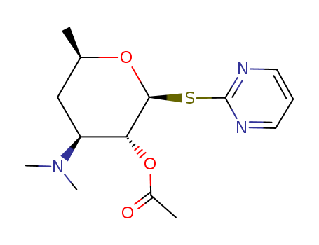 Acetic acid (2S,3R,4S,6R)-4-dimethylamino-6-methyl-2-(pyrimidin-2-ylsulfanyl)-tetrahydro-pyran-3-yl ester(119870-72-3)