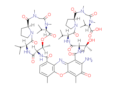- Synonyms:ActinomycinD acid, 9-(x-lactone) (8CI); Actinomycinicacid C1, lactone (7CI); 1H-Pyrrolo[2,1-i][1,4,7,10,13]oxatetraazacyclohexadecine,cyclic peptide deriv.; 3H-Phenoxazine, cyclic peptide deriv.; Actinomycinmonolactone; Stereoisomer ofN-[N-[1-[N-[N-[[2-amino-9-[[[hexadecahydro-2,5,9-trimethyl-6,13-bis(1-methylethyl)-1,4,7,11,14-pentaoxo-1H-pyrrolo[2,1-i][1,4,7,10,13]oxatetraazacyclohexadecin-10-yl]amino]carbonyl]-4,6-dimethyl-3-oxo-3H-phenoxazin-1-yl]carbonyl]-L-threonyl]-D-valyl]-L-prolyl]-N-methylglycyl]-N-methyl-L-valine