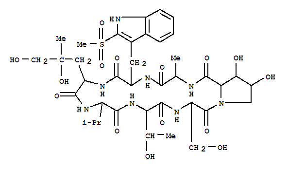 - Synonyms:Viroisin,3-[(S)-4,5-dihydroxy-L-leucine]-;1H-Pyrrolo[1,2-a][1,4,7,10,13,16,19]heptaazacycloheneicosine, cyclic peptidederiv.; Cyclo[L-alanyl-2-(methylsulfonyl)-L-tryptophyl-(S)-4,5-dihydroxy-L-leucyl-L-valyl-D-threonyl-D-seryl-(3R-trans)-3,4-dihydroxy-L-prolyl]