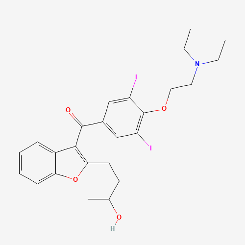 - Synonyms:Amiodarone metabolite M11-2;A5JF3R27N3;UNII-A5JF3R27N3;725684-62-8;(4-(2-(Diethylamino)ethoxy)-3,5-diiodophenyl)(2-(3-hydroxybutyl)-3-benzofuranyl)methanone;Methanone, (4-(2-(diethylamino)ethoxy)-3,5-diiodophenyl)(2-(3-hydroxybutyl)-3-benzofuranyl)-;3'-Hydroxylamiodarone;CHEMBL3526949