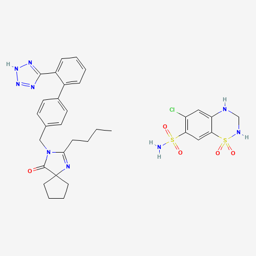 - Synonyms:Avalide;Karvezide;CoAprovel;Irbesartan-hydrochlorothiazide;448264-66-2;Irbesartan Hydrochlorothiazide BMS;Irbesartan Hydrochlorothiazide Winthrop;2-butyl-3-[[4-[2-(2H-tetrazol-5-yl)phenyl]phenyl]methyl]-1,3-diazaspiro[4.4]non-1-en-4-one;6-chloro-1,1-dioxo-3,4-dihydro-2H-1lambda6,2,4-benzothiadiazine-7-sulfonamide;SCHEMBL2527626;Hydrochlorothiazide / Irbesartan;DTXSID80196314;C25H28N6O.C7H8ClN3O4S2;HYDROCHLOROTHIAZIDE;IRBESARTAN;Irbesartan Hydrochlorothiazide Zentiva;LS-178480;C25-H28-N6-O.C7-H8-Cl-N3-O4-S2;2H-1,2,4-Benzothiadiazine-7-sulfonamide, 6-chloro-3,4-dihydro-, 1,1-dioxide, mixt. with 2-butyl-3-((2'-(1H-tetrazol-5-yl)(1,1'-biphenyl)-4-yl)methyl)-1,3-diazaspiro(4.4)non-1-en-4-one