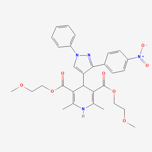 - Synonyms:360789-86-2;Bis(2-methoxyethyl) 2,6-dimethyl-4-(3-(4-nitrophenyl)-1-phenyl-1H-pyrazol-4-yl)-1,4-dihydropyridine-3,5-dicarboxylate;bis(2-methoxyethyl) 2,6-dimethyl-4-[3-(4-nitrophenyl)-1-phenyl-1H-pyrazol-4-yl]-1,4-dihydropyridine-3,5-dicarboxylate;ChemDiv1_002746;HMS594M18;STK726698;AKOS001614007;SR-01000425633;SR-01000425633-1;bis(2-methoxyethyl) 2,6-dimethyl-4-[3-(4-nitrophenyl)-1-phenyl-1H-pyrazol-4-yl]-1,4-dihydro-3,5-pyridinedicarboxylate