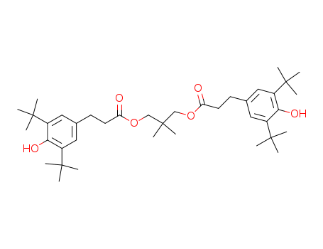 - Synonyms:Benzenepropanoicacid, 3,5-bis(1,1-dimethylethyl)-4-hydroxy-, 2,2-dimethyl-1,3-propanediyl ester(9CI); Hydrocinnamic acid, 3,5-di-tert-butyl-4-hydroxy-,2,2-dimethyltrimethylene ester (7CI,8CI); 1,3-Propanediol, 2,2-dimethyl-,bis(3,5-di-tert-butyl-4-hydroxyhydrocinnamate) (8CI);2,2-Dimethyl-1,3-bis[3-(4-hydroxy-3,5-di-tert-butylphenyl)propionyloxy]propane;2,2-Dimethyltrimethylene 3-(3,5-Di-tert-butyl-4-hydroxyphenyl)propionate;Neopentyl glycol bis[b-(3,5-di-tert-butyl-4-hydroxyphenyl)propionate]