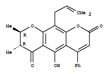 - Synonyms:2H,6H-Benzo[1,2-b:5,4-b']dipyran-2,6-dione,7,8-dihydro-5-hydroxy-7,8-dimethyl-10-(3-methyl-2-butenyl)-4-phenyl-,(7R,8R)-rel- (9CI); 2H,6H-Benzo[1,2-b:5,4-b']dipyran-2,6-dione,7,8-dihydro-5-hydroxy-7,8-dimethyl-10-(3-methyl-2-butenyl)-4-phenyl-, trans-;2H,6H-Benzo[1,2-b:5,4-b']dipyran-2,6-dione, 7,8-dihydro-5-hydroxy-7a,8b-dimethyl-10-(3-methyl-2-butenyl)-4-phenyl- (8CI);Calaustralin