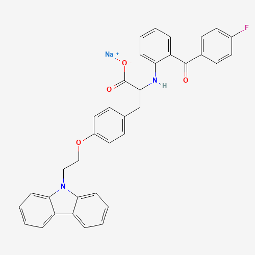 - Synonyms:Carfloglitazar sodium;Chiglitazar sodium, (+/-)-;95KY7G69XV;1959588-75-0;DL-Tyrosine, O-(2-(9H-carbazol-9-yl)ethyl)-N-(2-(4-fluorobenzoyl)phenyl)-, sodium;Tyrosine, O-(2-(9H-carbazol-9-yl)ethyl)-N-(2-(4-fluorobenzoyl)phenyl)-, sodium salt (1:1);D0F5JH;UNII-95KY7G69XV;Carfloglitazar sodium [WHO-DD];SCHEMBL23086249;CS-00098;PPAR alpha/gamma agonist (diabetes), Chipscreen Biosciences