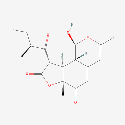- Synonyms:Chermesinone C;CHEMBL1801781;CHEBI:67398;DTXSID901101713;BDBM50347538;Q27135859;1300040-80-5;1H-Furo[2,3-h]-2-benzopyran-6,8(6aH,9H)-dione, 9a,9b-dihydro-1-hydroxy-3,6a-dimethyl-9-[(2S)-2-methyl-1-oxobutyl]-, (1S,6aR,9S,9aR,9bS)-;rel-(1S,6aR,9S,9aR,9bS)-1-hydroxy-3,6a-dimethyl-9-[(2S)-2-methylbutanoyl]-9a,9b-dihydro-1H-furo[2,3-h]isochromene-6,8(6aH,9H)-dione