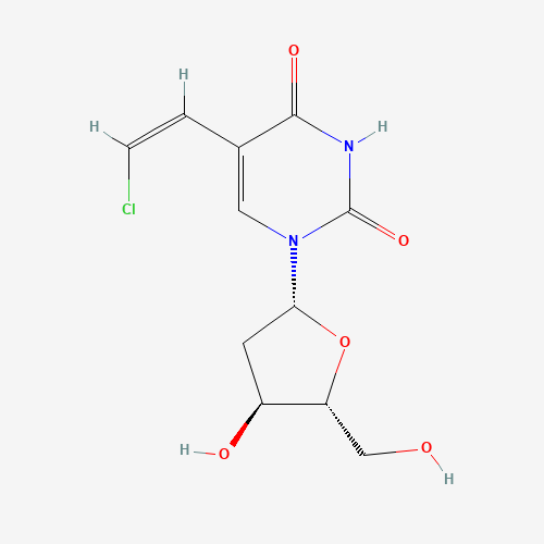 - Synonyms:Chloro brivudine, (Z)-;Cvdu, (Z)-;7K0JZH7XE8;UNII-7K0JZH7XE8;5-(2-Chlorovinyl)-2'-deoxyuridine, (Z)-;Uridine, 5-(2-chloroethenyl)-2'-deoxy-, (Z)-;130598-12-8;2,4(1H,3H)-Pyrimidinedione, 5-[(Z)-2-chloroethenyl]-1-(2-deoxy-b-D-erythro-pentofuranosyl)-;5-[(Z)-2-chlorovinyl]-1-[(2R,4S,5R)-4-hydroxy-5-(hydroxymethyl)tetrahydrofuran-2-yl]pyrimidine-2,4-dione