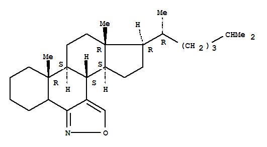 - Synonyms:5H-Cyclopenta[1,2]phenanthro[9,10-c]isoxazole,cholestano[6,7-c]isoxazole deriv.;5H-Cyclopenta[1,2]phenanthro[9,10-c]isoxazole,10-(1,5-dimethylhexyl)-3b,4,6,7,7a,7b,8,9,9a,10,11,12,12a,12b-tetradecahydro-7a,9a-dimethyl-,[7aR-[7aa,7bb,9aa,10a(R*),12ab,12ba]]-; [7aR-[7aa,7bb,9aa,10a(R*),12ab,12ba]]-10-(1,5-Dimethylhexyl)-3b,4,6,7,7a,7b,8,9,9a,10,11,12,12a,12b-tetradecahydro-7a,9a-dimethyl-5H-cyclopenta[1,2]phenanthro[9,10-c]isoxazole