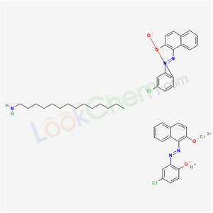 - Synonyms:Chromate, bis[1-[(5-chloro-2-hydroxyphenyl)azo]-2-naphthalenolato ]-, hydrogen, compd. with 1-tetradecanamine;Chromate,bis[1-[(5-chloro-2-hydroxyphenyl)azo]-2-naphthalenolato]-,hydrogen,compd. with 1-tetradecanamine;drogen, compd. with 1-tetradecanamine;Bis[1-[(5-chloro-2-hydroxyphenyl)azo]-2-naphthalenolato(2-)]chromate(1-), hydrogen, compound with 1-tetradecanamine (1:1);Chromate(1-), bis[1-[(5-chloro-2-hydroxyphenyl) azo]-2-naphthalenolato(2-)]-, hydrogen, compd. with 1-tetradecanamine (1:1);tetradecylammonium bis(1-(5-chloro-2-oxidophenylazo)-2-naphtholato)chromate(1-)