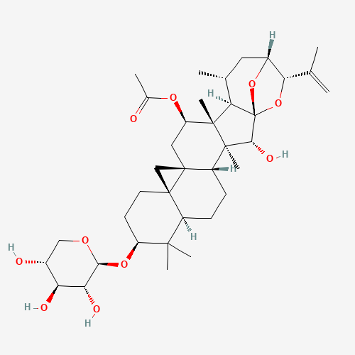 - Synonyms:Cimiracemoside K;Cimiracemoside K, (-)-;UNII-MAB9A9VY5X;MAB9A9VY5X;473554-75-5;12-O-Acetyl-25-anhydrocimigenol-3-o-beta-D-xylopyranoside;beta-D-Xylopyranoside, (3beta,12beta,15alpha,16alpha,23R,24S)-12-(acetyloxy)-16,23:16,24-diepoxy-15-hydroxy-9,19-cyclolanost-25-en-3-yl;[(1S,2R,3S,4R,7R,9S,12R,14R,16R,17R,18R,19R,21R,22S)-2-hydroxy-3,8,8,17,19-pentamethyl-22-prop-1-en-2-yl-9-[(2S,3R,4S,5R)-3,4,5-trihydroxyoxan-2-yl]oxy-23,24-dioxaheptacyclo[19.2.1.01,18.03,17.04,14.07,12.012,14]tetracosan-16-yl] acetate;CHEBI:70251;Q27138591;12-O-ACETYL-25-ANHYDROCIMIGENOL-3-O-.BETA.-D-XYLOPYRANOSIDE;.BETA.-D-XYLOPYRANOSIDE, (3.BETA.,12.BETA.,15.ALPHA.,16.ALPHA.,23R,24S)-12-(ACETYLOXY)-16,23:16,24-DIEPOXY-15-HYDROXY-9,19-CYCLOLANOST-25-EN-3-YL