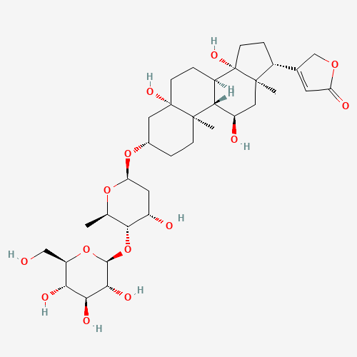 - Synonyms:Corchorusoside A;CHEBI:169844;DTXSID301106189;(3beta,5beta,11alpha)-3-[(2,6-Dideoxy-4-O-beta-D-glucopyranosyl-beta-D-ribo-hexopyranosyl)oxy]-5,11,14-trihydroxycard-20(22)-enolide;210637-15-3;3-[(3S,5S,8R,9S,10R,11R,13R,14S,17R)-5,11,14-trihydroxy-3-[(2R,4S,5S,6R)-4-hydroxy-6-methyl-5-[(2S,3R,4S,5S,6R)-3,4,5-trihydroxy-6-(hydroxymethyl)oxan-2-yl]oxyoxan-2-yl]oxy-10,13-dimethyl-2,3,4,6,7,8,9,11,12,15,16,17-dodecahydro-1H-cyclopenta[a]phenanthren-17-yl]-2H-uran-5-one