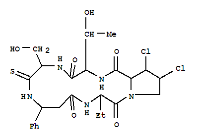 - Synonyms:Cyclo[(R)-3-phenyl-b-alanyl-L-2-aminobutanoyl-(2a,3a,4a)-3,4-dichloro-L-prolyl-L-allothreonylthio-L-seryl]; Thioastin B
