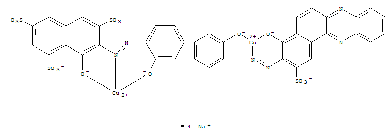 - Synonyms:Cuprate(4-),[m-[7-[[3,3'-di(hydroxy-kO)-4'-[[4-(hydroxy-kO)-2-sulfobenzo[a]phenazin-3-yl]azo-kN1][1,1'-biphenyl]-4-yl]azo-kN1]-8-(hydroxy-kO)-1,3,6-naphthalenetrisulfonato(8-)]]di-,tetrasodium (9CI); Cuprate(4-), [m-[7-[[3,3'-dihydroxy-4'-[(4-hydroxy-2-sulfobenzo[a]phenazin-3-yl)azo][1,1'-biphenyl]-4-yl]azo]-8-hydroxy-1,3,6-naphthalenetrisulfonato(8-)]]di-,tetrasodium; 1,3,6-Naphthalenetrisulfonic acid,7-[[3,3'-dihydroxy-4'-[(4-hydroxy-2-sulfobenzo[a]phenazin-3-yl)azo][1,1'-biphenyl]-4-yl]azo]-8-hydroxy-,copper complex; Benzo[a]phenazine, 1,3,6-naphthalenetrisulfonic acid deriv.,copper complex; Benzo[a]phenazine, cuprate(4-) deriv.; C.I. 231560; C.I. DirectBlue 90; Chloramine Chrome Blue FGL; Cuprofix Blue FGL; Cuprofix Printing BlueFGL; Direct Blue 90; Indosol Blue SF 2G; Intralite Blue FGL; Kayarus Supra BlueFGL conc; Pyrazol Fast Blue FGL; Sumilight Supra Blue FGL