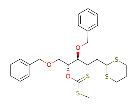 - Synonyms:Dithiocarbonic acid O-((1R,2S)-2-benzyloxy-1-benzyloxymethyl-4-[1,3]dithian-2-yl-butyl) ester S-methyl ester