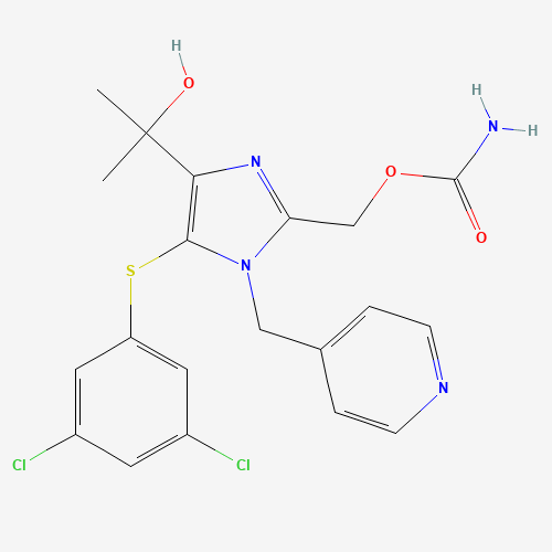 - Synonyms:ECG1QCI7DB;Capravirine metabolite C19/m4;UNII-ECG1QCI7DB;757211-45-3;1H-Imidazole-2,4-dimethanol, 5-((3,5-dichlorophenyl)thio)-alpha4,alpha4-dimethyl-1-(4-pyridinylmethyl)-, 2-carbamate;5-((3,5-Dichlorophenyl)thio)-alpha4,alpha4-dimethyl-1-(4-pyridinylmethyl)-1H-imidazole-2,4-dimethanol 2-carbamate;1H-IMIDAZOLE-2,4-DIMETHANOL, 5-((3,5-DICHLOROPHENYL)THIO)-.ALPHA.4,.ALPHA.4-DIMETHYL-1-(4-PYRIDINYLMETHYL)-, 2-CARBAMATE;5-((3,5-DICHLOROPHENYL)THIO)-.ALPHA.4,.ALPHA.4-DIMETHYL-1-(4-PYRIDINYLMETHYL)-1H-IMIDAZOLE-2,4-DIMETHANOL 2-CARBAMATE