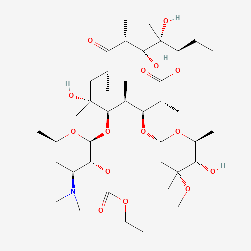 - Synonyms:Erythromycin ethyl carbonate;2''-o-Ethoxycarbonylerythromycin;914076-30-5;Erythromycin 2''-carbonic acid ethyl ester;J227.451E;UNII-57T92VJ835;57T92VJ835;Erythromycin, 2'-(ethyl carbonate);4-(Dimethylamino)-2-((14-ethyl-7,12,13-trihydroxy-4-((5-hydroxy-4-methoxy-4,6-dimethyltetrahydro-2H-pyran-2-yl)oxy)-3,5,7,9,11,13-hexamethyl-2,10-dioxooxacyclotetradecan-6-yl)oxy)-6-methyltetrahydro-2 H-pyran-3-yl ethyl carbonate;EINECS 230-615-1;(2S,3R,4S,6R)-4-(dimethylamino)-2-(((3R,4S,5S,6R,7R,9R,11R,12R,13S,14R)-14-ethyl-7,12,13-trihydroxy-4-(((2R,4R,5S,6S)-5-hydroxy-4-methoxy-4,6-dimethyltetrahydro-2H-pyran-2-yl)oxy)-3,5,7,9,11,13-hexamethyl-2,10-dioxooxacyclotetradecan-6-yl)oxy)-6-methyltetrahydro-2H-pyran-3-yl ethyl carbonate;C40H71NO15;C40-H71-N-O15;7218-80-6;CHEMBL2106182;Q27261523;[(2S,3R,4S,6R)-4-(dimethylamino)-2-[[(3R,4S,5S,6R,7R,9R,11R,12R,13S,14R)-14-ethyl-7,12,13-trihydroxy-4-[(2R,4R,5S,6S)-5-hydroxy-4-methoxy-4,6-dimethyloxan-2-yl]oxy-3,5,7,9,11,13-hexamethyl-2,10-dioxo-oxacyclotetradec-6-yl]oxy]-6-methyloxan-3-yl] ethyl carbonate