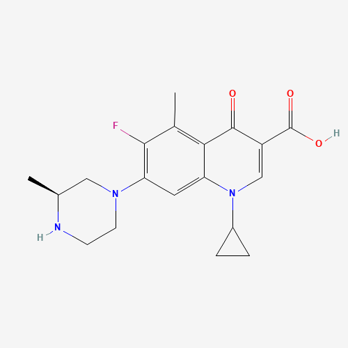 - Synonyms:Grepafloxacin, (S)-;L-Grepafloxacin;Grepafloxacin, (-)-;146761-69-5;UNII-1QUW88X868;1QUW88X868;3-Quinolinecarboxylic acid, 1-cyclopropyl-6-fluoro-1,4-dihydro-5-methyl-7-((3S)-3-methyl-1-piperazinyl)-4-oxo;3-Quinolinecarboxylic acid, 1-cyclopropyl-6-fluoro-1,4-dihydro-5-methyl-7-(3-methyl-1-piperazinyl)-4-oxo-, (S)-;(S)-1-cyclopropyl-6-fluoro-5-methyl-7-(3-methylpiperazin-1-yl)-4-oxo-1,4-dihydroquinoline-3-carboxylic acid;(S)-grepafloxacin;(?)-Grepafloxacin;SCHEMBL34156;AKOS040746864;Q27252767;1-cyclopropyl-6-fluoro-5-methyl-7-[(3S)-3-methylpiperazin-1-yl]-4-oxoquinoline-3-carboxylic acid