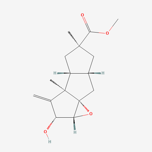 - Synonyms:Hirsutic acid methyl ester;QHZ1A4KPHB;UNII-QHZ1A4KPHB;Hirsutic acid C methyl ester [MI];3650-16-6;1H-Cyclopenta(a)pentalene-2-carboxylic acid, 6beta,6abeta-epoxy-2,3,3aalpha,3b,4,5,6,6a,7,7aalpha-decahydro-5beta-hydroxy-2beta,3bbeta-dimethyl-4-methylene-, methyl ester, (+)-;Q27287269;1H-CYCLOPENTA(A)PENTALENE-2-CARBOXYLIC ACID, 6.BETA.,6A.BETA.-EPOXY-2,3,3A.ALPHA.,3B,4,5,6,6A,7,7A.ALPHA.-DECAHYDRO-5.BETA.-HYDROXY-2.BETA.,3B.BETA.-DIMETHYL-4-METHYLENE-, METHYL ESTER, (+)-