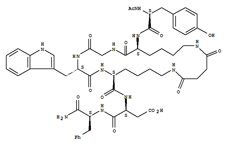 - Synonyms:L-Phenylalaninamide,N-acetyl-L-tyrosyl-N6-(3-carboxy-1-oxopropyl)-L-lysylglycyl-L-tryptophyl-L-lysyl-L-a-aspartyl-, cyclic (2®5)-peptide;1,4,7,13,18-Pentaazacyclotetracosane, cyclic peptide deriv.; JMV 320