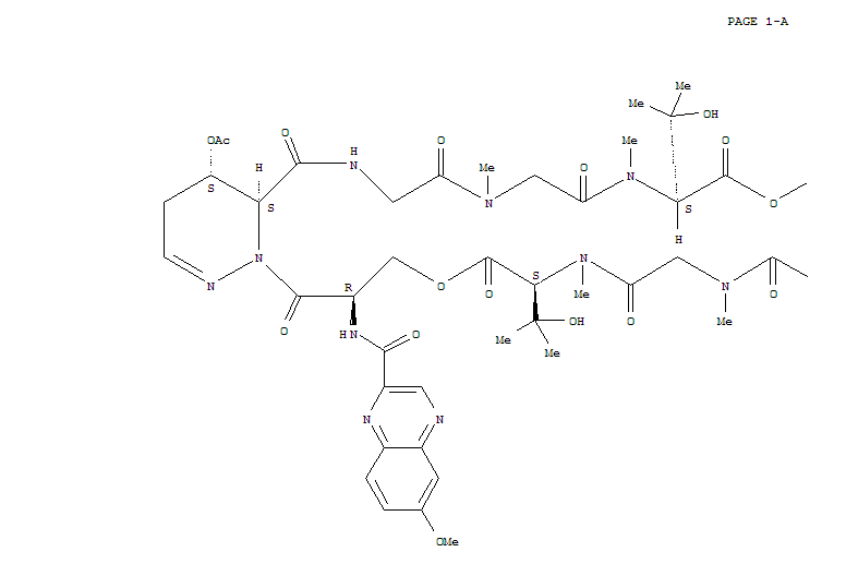 - Synonyms:BMY 46572;L-Valine,N-[(6-methoxy-2-quinoxalinyl)carbonyl]-D-seryl-L-trans-4-(acetyloxy)-2,3,4,5-tetrahydro-3-pyridazinecarbonylglycyl-N-methylglycyl-3-hydroxy-N-methyl-,cyclic (5®1'),(5'®1)-dilactone withN-[(6-methoxy-2-quinoxalinyl)carbonyl]-D-seryl-L-trans-2,3,4,5-tetrahydro-4-(2-methyl-1-oxopropoxy)-3-pyridazinecarbonylglycyl-N-methylglycyl-3-hydroxy-N-methyl-L-valine