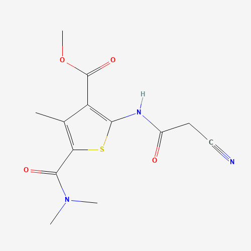 - Synonyms:546090-59-9;METHYL 2-[(CYANOACETYL)AMINO]-5-[(DIMETHYLAMINO)-CARBONYL]-4-METHYLTHIOPHENE-3-CARBOXYLATE;methyl 2-[(2-cyanoacetyl)amino]-5-(dimethylcarbamoyl)-4-methylthiophene-3-carboxylate;methyl 2-[(cyanoacetyl)amino]-5-[(dimethylamino)carbonyl]-4-methylthiophene-3-carboxylate;methyl 2-(2-cyanoacetamido)-5-(dimethylcarbamoyl)-4-methylthiophene-3-carboxylate;methyl 2-[(cyanoacetyl)amino]-5-(dimethylcarbamoyl)-4-methylthiophene-3-carboxylate;Oprea1_049994;DTXSID901121115;BBL016780;MFCD03394772;STK434484;AKOS003276450;VS-05562;Methyl 2-[(2-cyanoacetyl)amino]-5-[(dimethylamino)carbonyl]-4-methyl-3-thiophenecarboxylate;methyl2-(2-cyanoacetamido)-5-(dimethylcarbamoyl)-4-methylthiophene-3-carboxylate