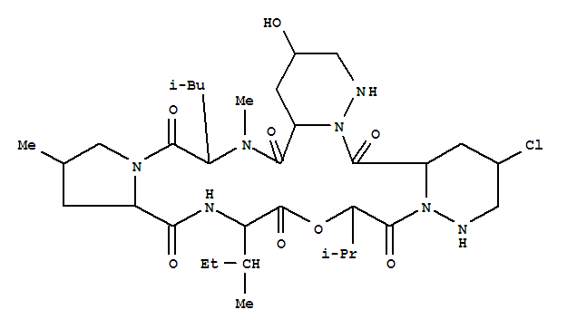- Synonyms:2H-Dipyridazino[1,6-d:1',6'-g]pyrrolo[1,2-m][1,4,7,10,13,16]oxapentaazacyclooctadecine,cyclic peptide deriv.; D-Isoleucine, N-[1-[N-[[2-[[D-trans-5-chlorohexahydro-2-(L-2-hydroxy-3-methyl-1-oxobutyl)-3-pyridazinyl]carbonyl]-L-hexahydro-cis-5-hydroxy-3-pyridazinyl]carbonyl]-N-methyl-D-leucyl]-trans-4-methyl-L-prolyl]-,p-lactone;N-[1-[N-[[2-[[D-trans-5-Chlorohexahydro-2-(L-2-hydroxy-3-methyl-1-oxobutyl)-3-pyridazinyl]carbonyl]-L-hexahydro-cis-5-hydroxy-3-pyridazinyl]carbonyl]-N-methyl-D-leucyl]-trans-4-methyl-L-prolyl]-D-isoleucinep-lactone