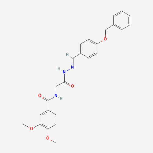 - Synonyms:STK696739;AKOS001719252;N-(2-(2-(4-(BENZYLOXY)BENZYLIDENE)HYDRAZINO)-2-OXOETHYL)-3,4-DIMETHOXYBENZAMIDE;N-({N'-[(E)-[4-(BENZYLOXY)PHENYL]METHYLIDENE]HYDRAZINECARBONYL}METHYL)-3,4-DIMETHOXYBENZAMIDE;N-(2-{(2E)-2-[4-(benzyloxy)benzylidene]hydrazinyl}-2-oxoethyl)-3,4-dimethoxybenzamide (non-preferred name)