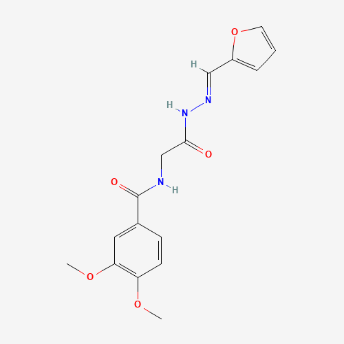 - Synonyms:N-(2-(2-(Furan-2-ylmethylene)hydrazinyl)-2-oxoethyl)-3,4-dimethoxybenzamide;223676-17-3;MLS000912163;CHEMBL3192712;SCHEMBL14583847;YJHACQYJACPSDQ-GIJQJNRQSA-N;AKOS001605095;SMR000619669;N2-Veratroylglycine N'-furfurylidenehydrazide;SR-01000106932;SR-01000106932-1;N-(2-(2-(2-FURYLMETHYLENE)HYDRAZINO)-2-OXOETHYL)-3,4-DIMETHOXYBENZAMIDE;N-(2-[(2E)-2-(2-Furylmethylene)hydrazino]-2-oxoethyl)-3,4-dimethoxybenzamide #;N-({N'-[(E)-(FURAN-2-YL)METHYLIDENE]HYDRAZINECARBONYL}METHYL)-3,4-DIMETHOXYBENZAMIDE