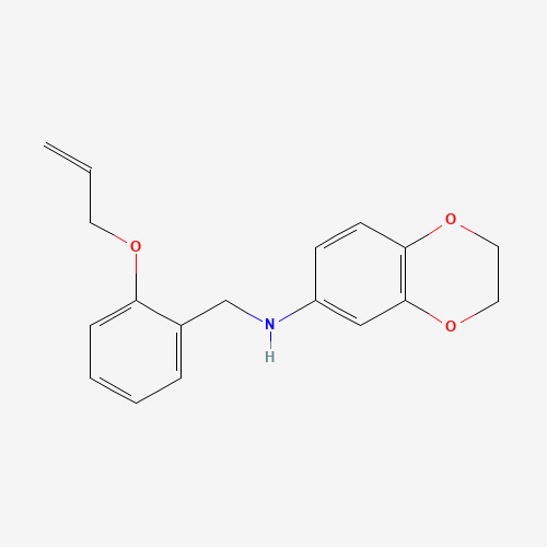 - Synonyms:861233-81-0;N-{[2-(prop-2-en-1-yloxy)phenyl]methyl}-2,3-dihydro-1,4-benzodioxin-6-amine;N-[2-(allyloxy)benzyl]-N-2,3-dihydro-1,4-benzodioxin-6-ylamine;CHEMBL1621319;DTXSID701145218;EN300-35530;2,3-Dihydro-N-[[2-(2-propen-1-yloxy)phenyl]methyl]-1,4-benzodioxin-6-amine