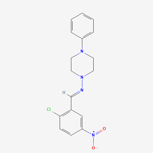 - Synonyms:MLS000572555;CHEMBL3194765;AKOS001614154;SMR000194054;BIM-0007359.P001;N-(2-chloro-5-nitrobenzylidene)-4-phenyl-1-piperazinamine;N-[(1E)-(2-chloro-5-nitrophenyl)methylene]-4-phenylpiperazin-1-amine;N-[(E)-(2-chloro-5-nitrophenyl)methylidene]-4-phenyl-1-piperazinamine