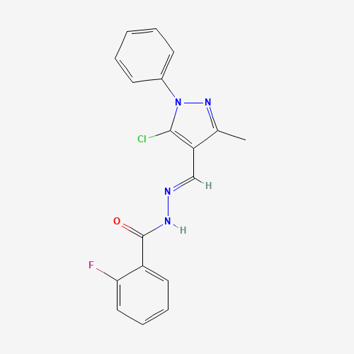 - Synonyms:MLS001044413;CHEMBL3210865;DTXSID801327299;STK745642;AKOS005527440;N-[(E)-(5-chloro-3-methyl-1-phenylpyrazol-4-yl)methylideneamino]-2-fluorobenzamide;384358-66-1;SMR000424772;N'-[(E)-(5-chloro-3-methyl-1-phenyl-1H-pyrazol-4-yl)methylidene]-2-fluorobenzohydrazide;2-Fluoro-benzoic acid [1-(5-chloro-3-methyl-1-phenyl-1H-pyrazol-4-yl)-meth-(E)-ylidene]-hydrazide