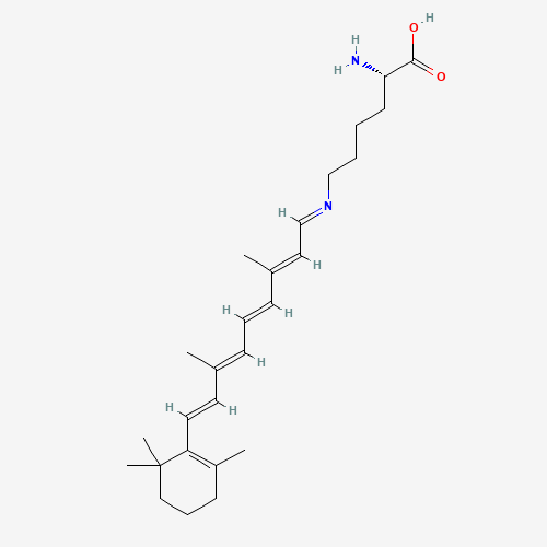 - Synonyms:N6-(Retinylidene)lysine;34372-62-8;N91ZRU450Q;(E)-N6-((2E,4E,6E,8E)-3,7-dimethyl-9-(2,6,6-trimethylcyclohex-1-en-1-yl)nona-2,4,6,8-tetraen-1-ylidene)-L-lysine;L-Lysine, N6-((2E,4E,6E,8E)-3,7-dimethyl-9-(2,6,6-trimethyl-1-cyclohexen-1-yl)-2,4,6,8-nonatetraen-1-ylidene)-;Lysine, N6-(3,7-dimethyl-9-(2,6,6-trimethyl-1-cyclohexen-1-yl)-2,4,6,8-nonatetraenylidene)-, L-all-trans-;N6-((2E,4E,6E,8E)-3,7-Dimethyl-9-(2,6,6-trimethyl-1-cyclohexen-1-yl)-2,4,6,8-nonatetraen-1-ylidene)-L-lysine;UNII-N91ZRU450Q;AKOS040753191;Nepsilon-All-trans-retinylidene-L-lysine;N.EPSILON.-ALL-TRANS-RETINYLIDENE-L-LYSINE;Q27896877;(2S)-2-amino-6-[[(2E,4E,6E,8E)-3,7-dimethyl-9-(2,6,6-trimethylcyclohexen-1-yl)nona-2,4,6,8-tetraenylidene]amino]hexanoic acid